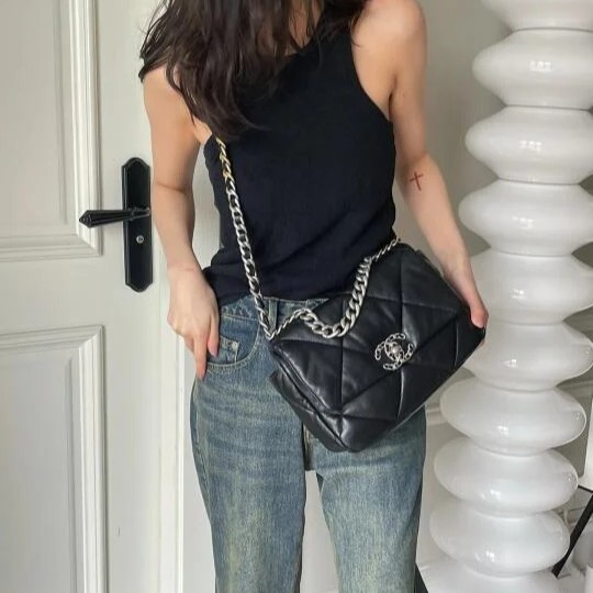Chanel 19 Handbag 黑色銀釦小號,經典黑色羊皮搭配銀色金屬鏈帶,展現時尚與奢華。柔軟皮革與獨特大菱格紋設計,讓包款兼具實用與優雅,是日常造型的完美選擇
