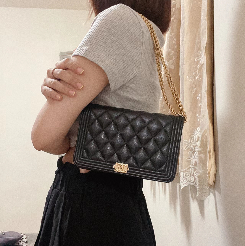 Chanel Boy woc黑色金釦款式,將時尚與功能完美融合。這款鏈條手袋設計獨特,內部空間寬敞,適合收納鈔票、卡片及小物。高品質材料與精緻工藝展現奢華感,無論是日常使用或特別場合,都是提升造型的絕佳選擇。