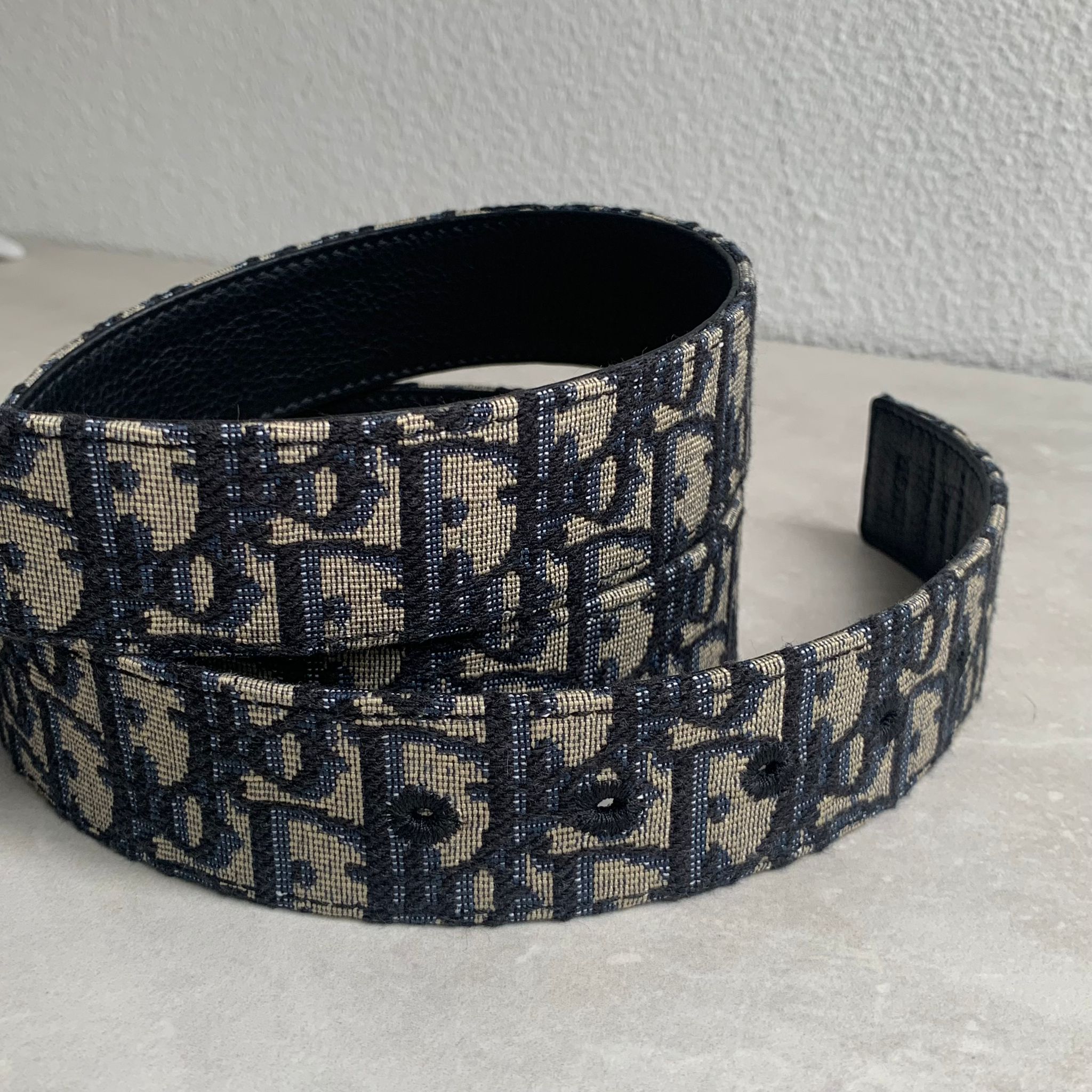一側採用藍色光滑小牛皮,另一側採用藍色 Dior Oblique 提花面料,