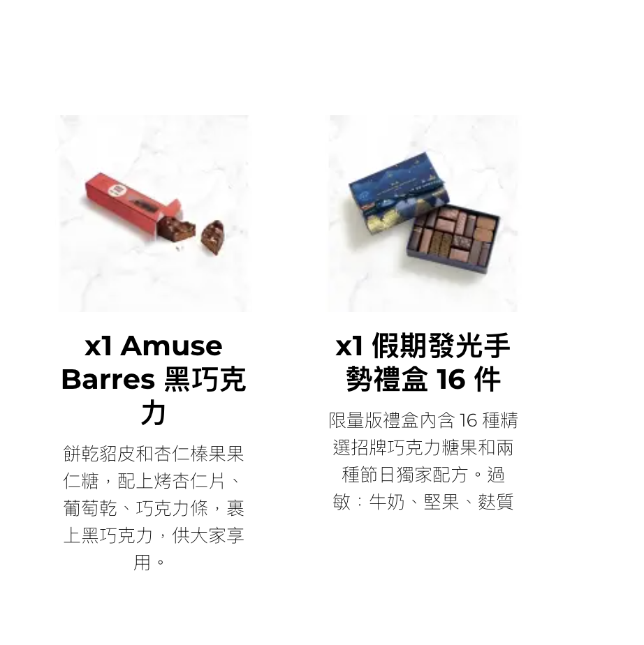 步入異想天開的冬季仙境,鏡子和鐘擺反射著夜空的光芒。這個假期,La Maison du Chocolat 推出了兩款特別食譜:黑巧克力甘納許搭配優質峇裡島可可,以及牛奶巧克力果仁糖搭配甜香草和絲滑核桃醬。用我們的節日帽盒分享節日光芒的溫暖,帽盒採用優雅的禮品包裝,採用金色裝飾和皮革紋理。 商品評價目前沒有評價。 搶先評價 “La Maison Luminous Journey 帽盒”取消回覆發佈留言必須填寫的電子郵件地址不會公開。 必填欄位標示為 *您的評分 *評分…完美很好一般不錯很差 名稱 *電子郵件 *您的評價 *送出 Δ