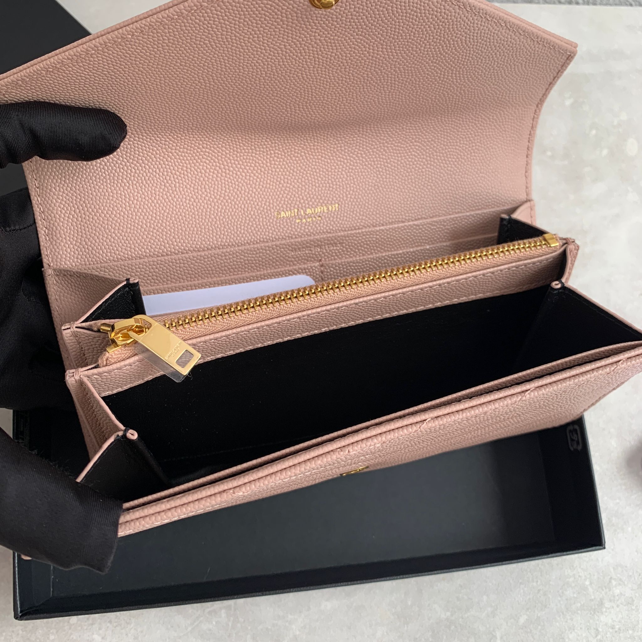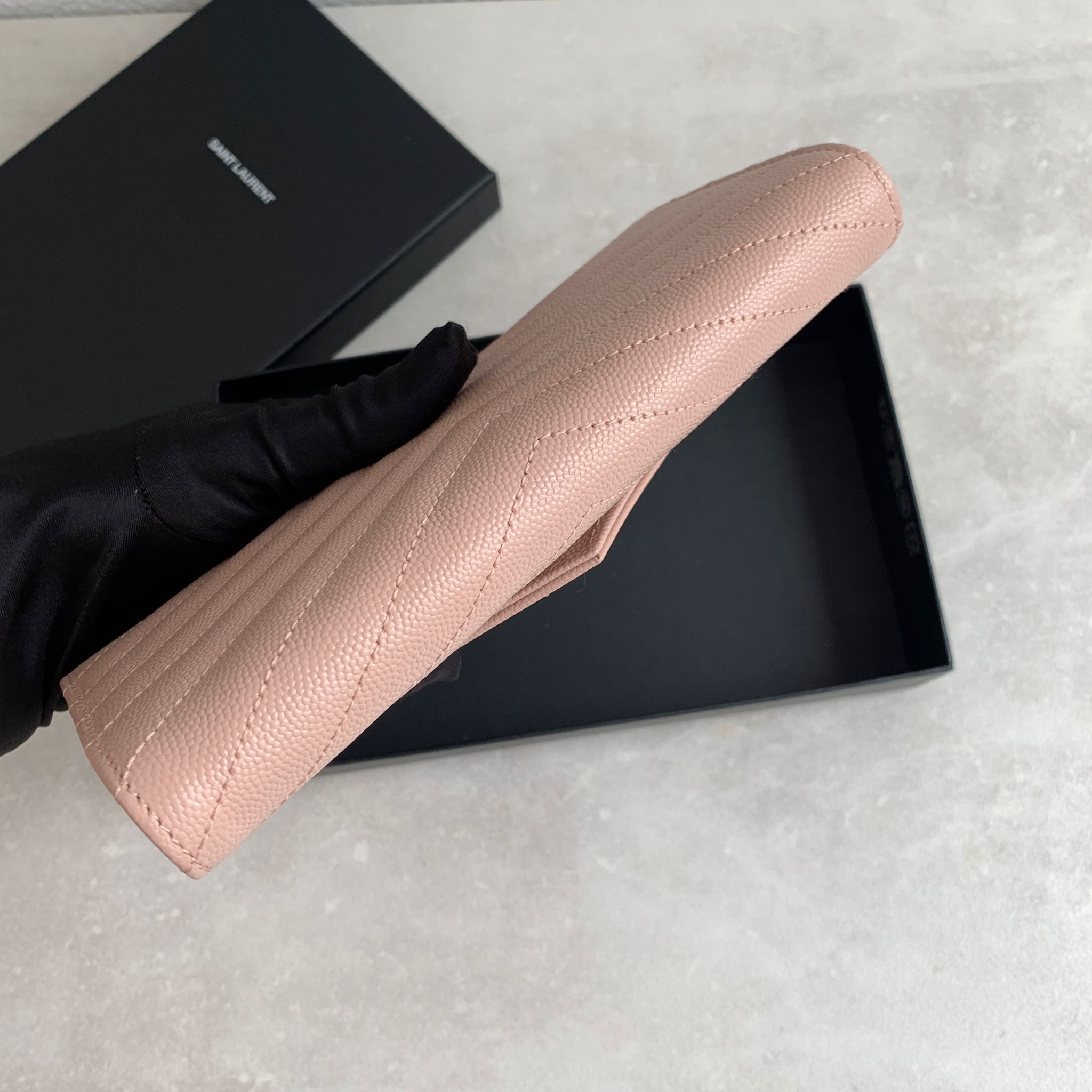 搶先評價 “Ysl Cassandre Saint Laurent Matelasse 淡粉色荔枝皮翻蓋信封長夾”